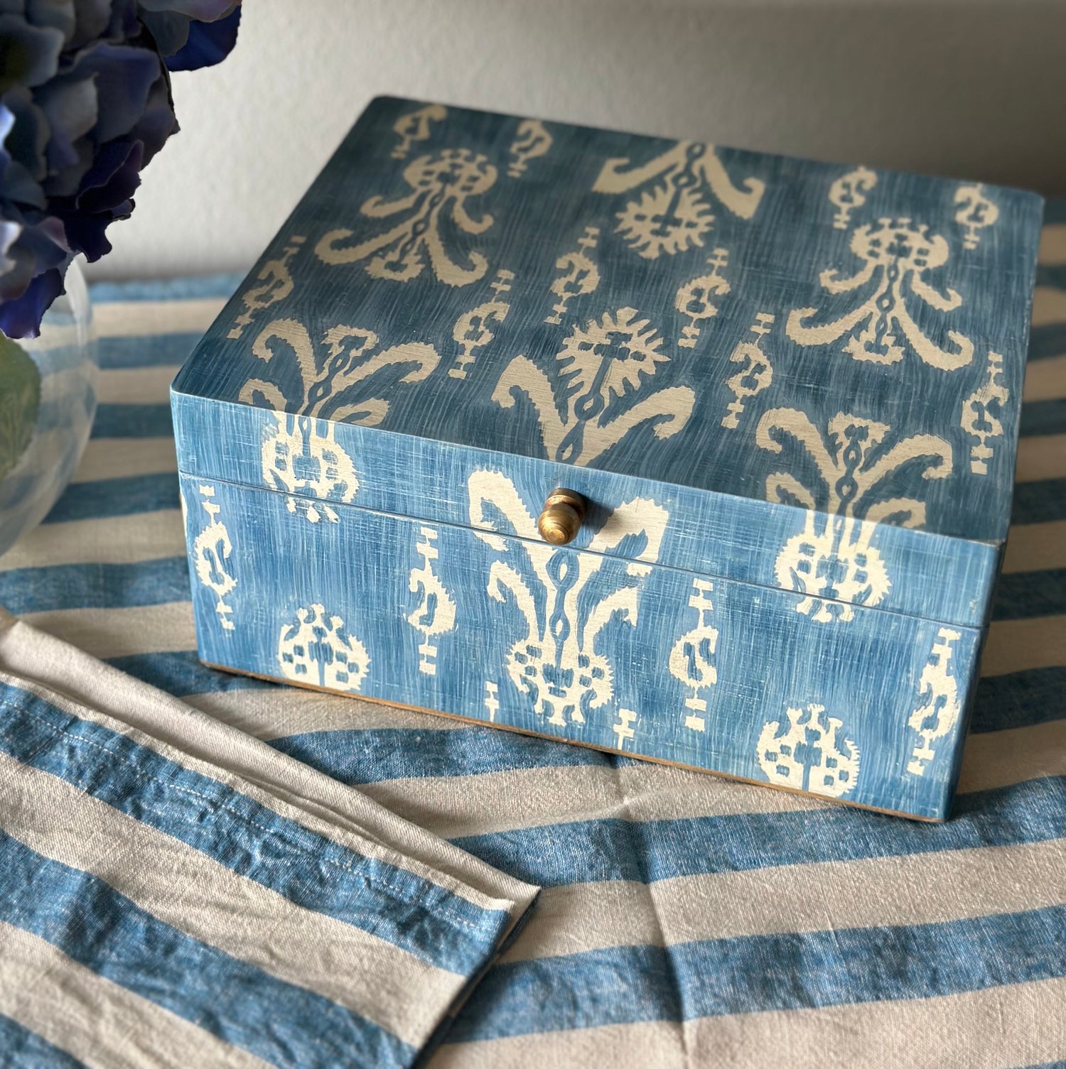 We’ve also used the Ikat motif to work with artisans in India to hand paint this design on home décor products. Our painted ikat