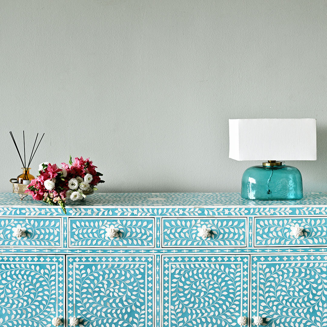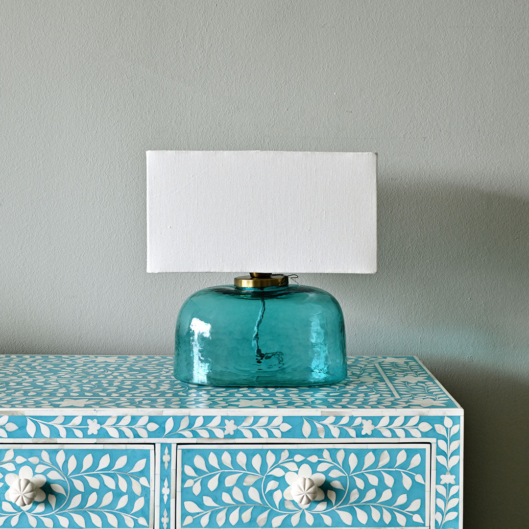 Our glass lamp in a beautiful aqua colour! This unusual lamp can be paired with a shade or used without a shade as well. You are sure to love it's brilliant colour.