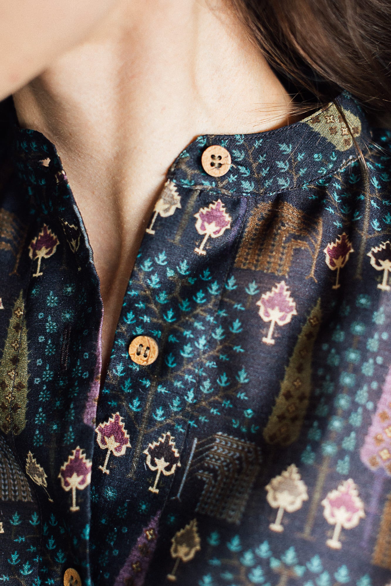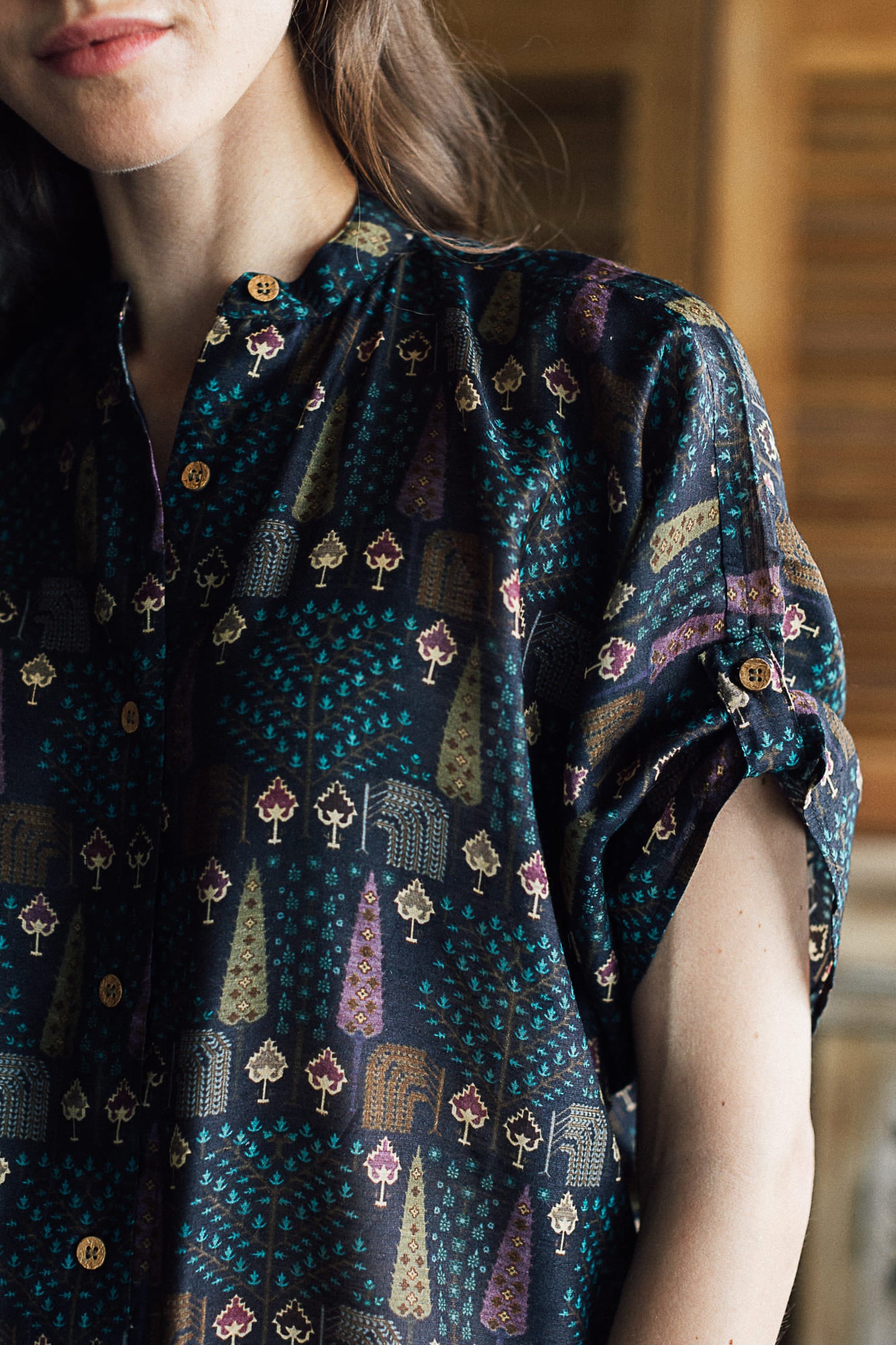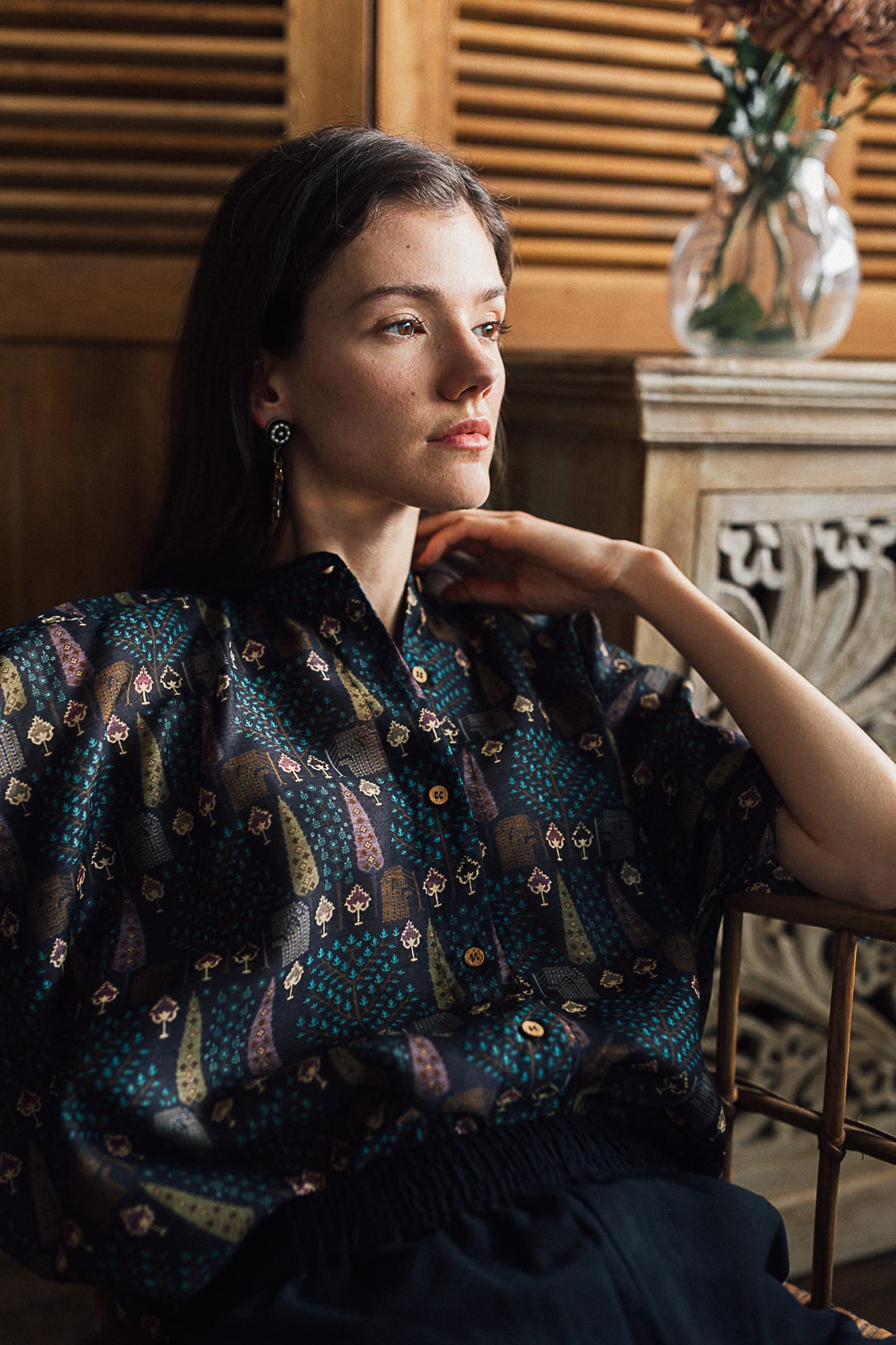 Our black summer silk shirt is hand printed in a beautiful pattern inspired by a cypress forest. The colours are subtle and elegant. Pair it with your favourite black trousers for a perfect evening out. The silk fabric is light and breathable and is perfect for the evenings.