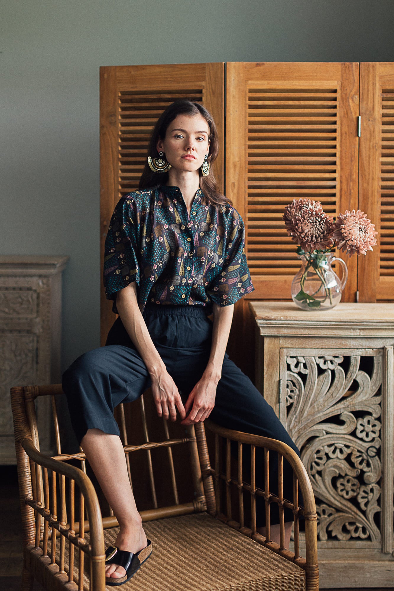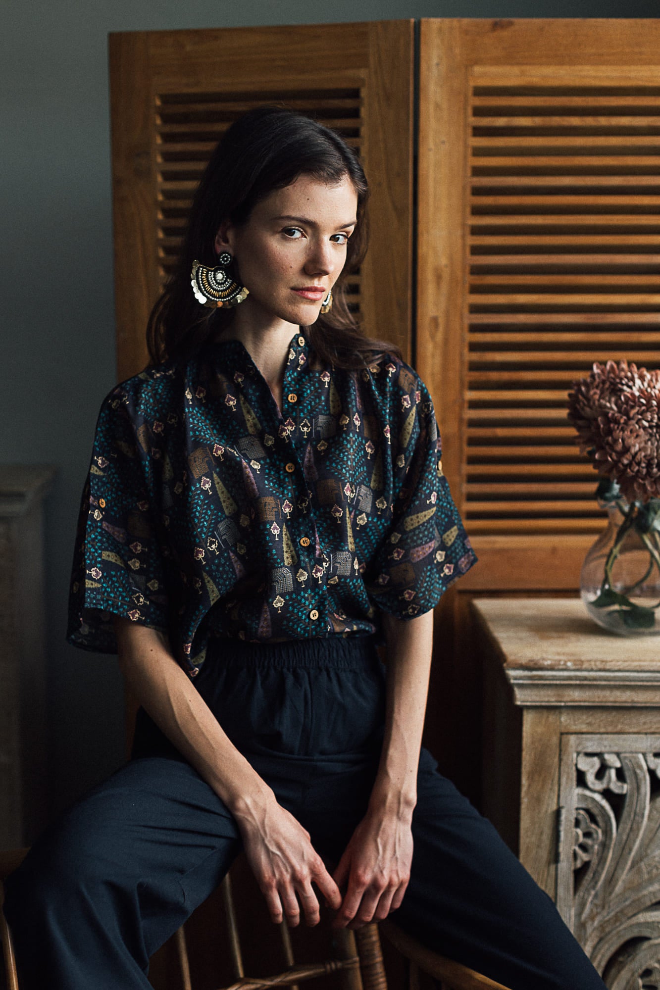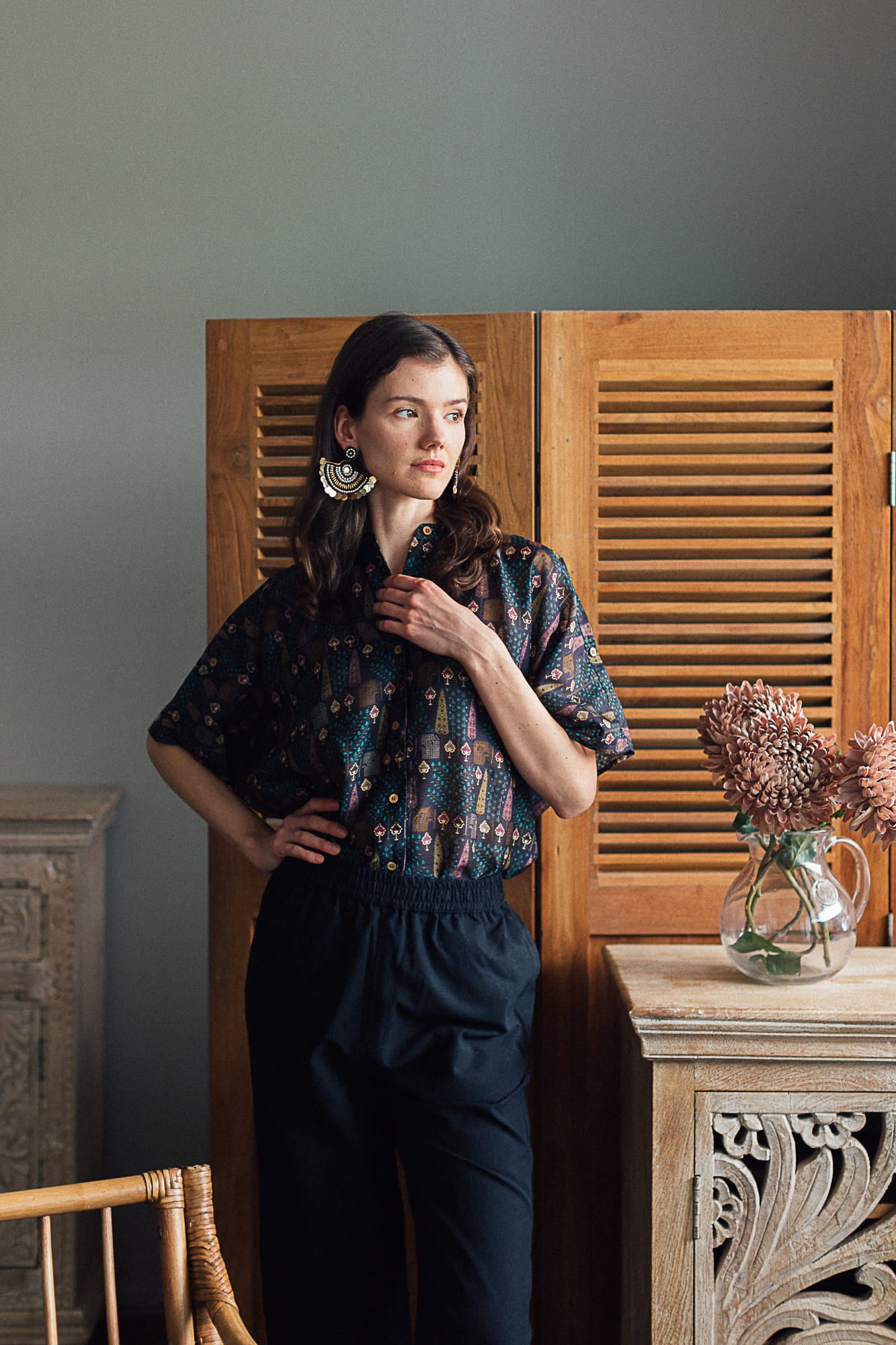 Our black summer silk shirt is hand printed in a beautiful pattern inspired by a cypress forest. The colours are subtle and elegant. Pair it with your favourite black trousers for a perfect evening out. The silk fabric is light and breathable and is perfect for the evenings.