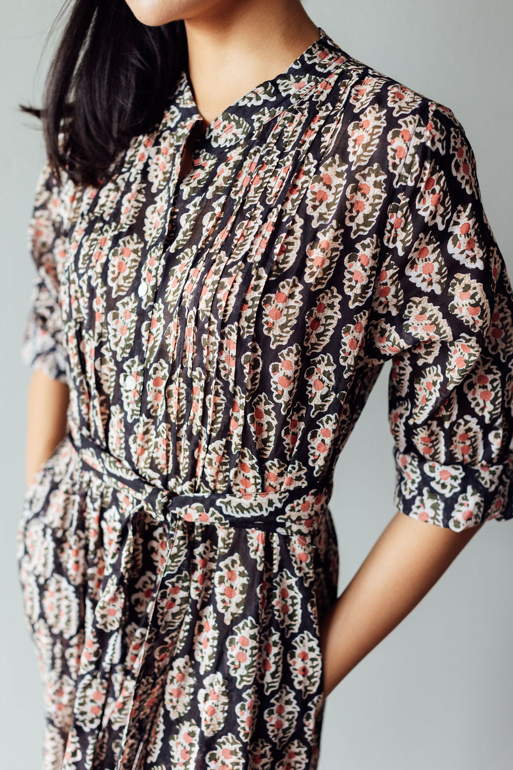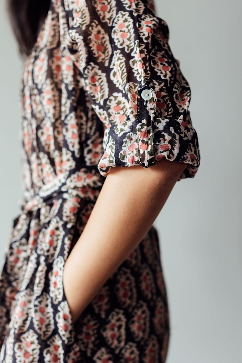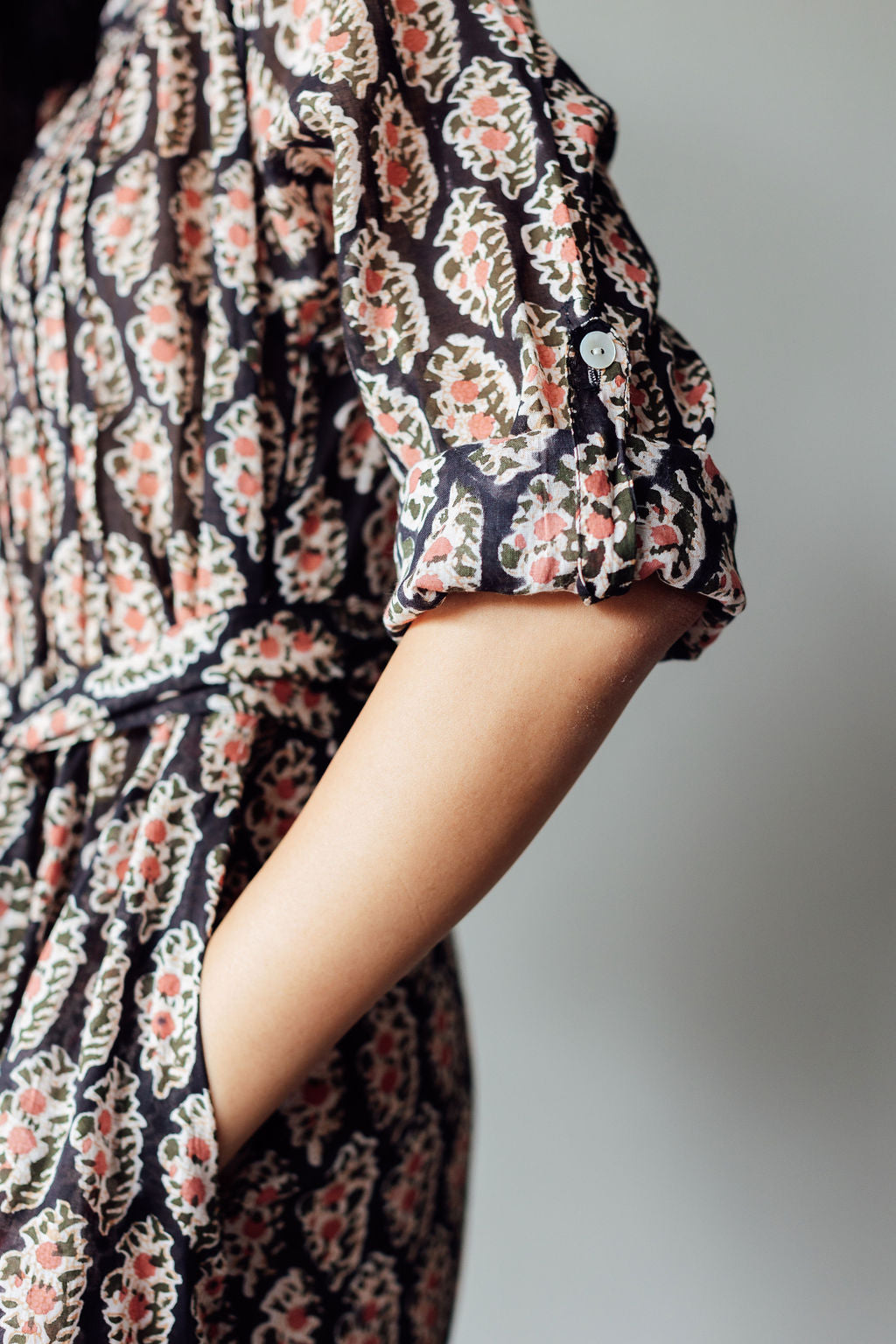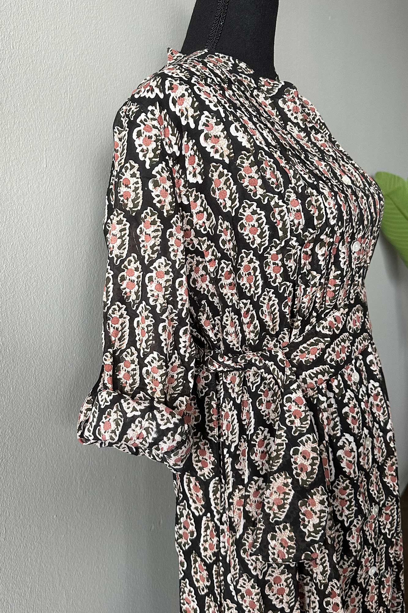 The Tulip midi is one of our favourite silhouettes. You can wear it with or without the sash belt that accompanies it. We like rolling up the sleeves and buttoning them. Block Printed on cotton with a black base patterned with delicate peach coloured flowers.