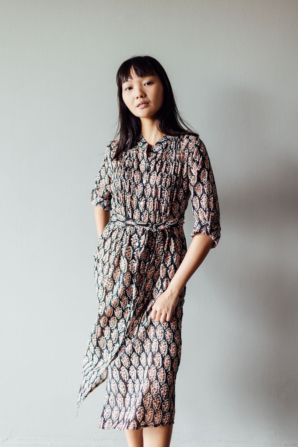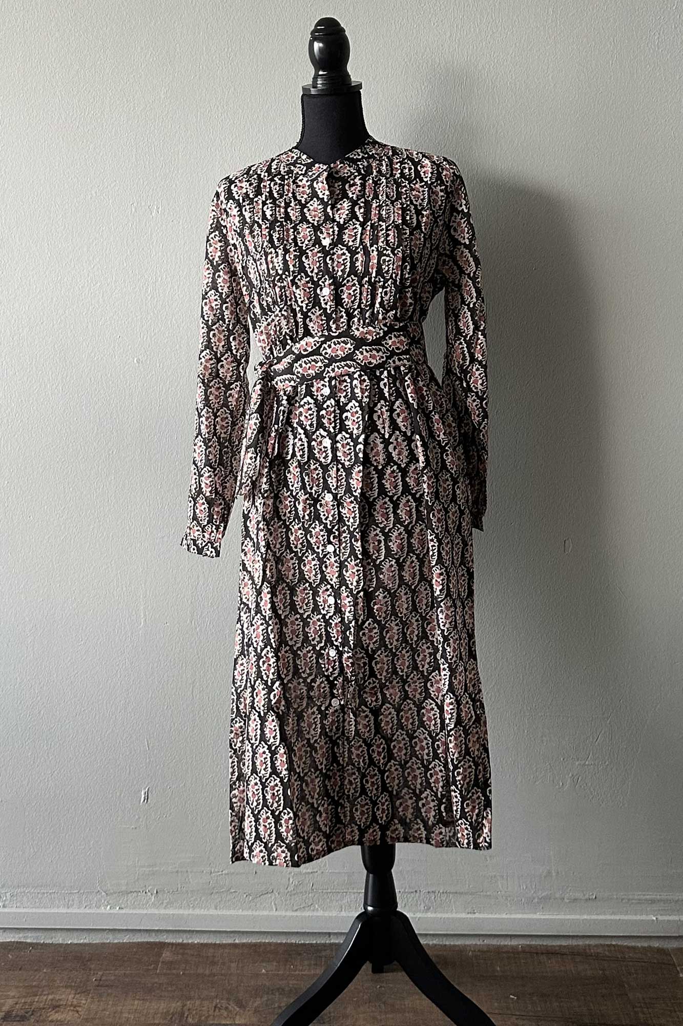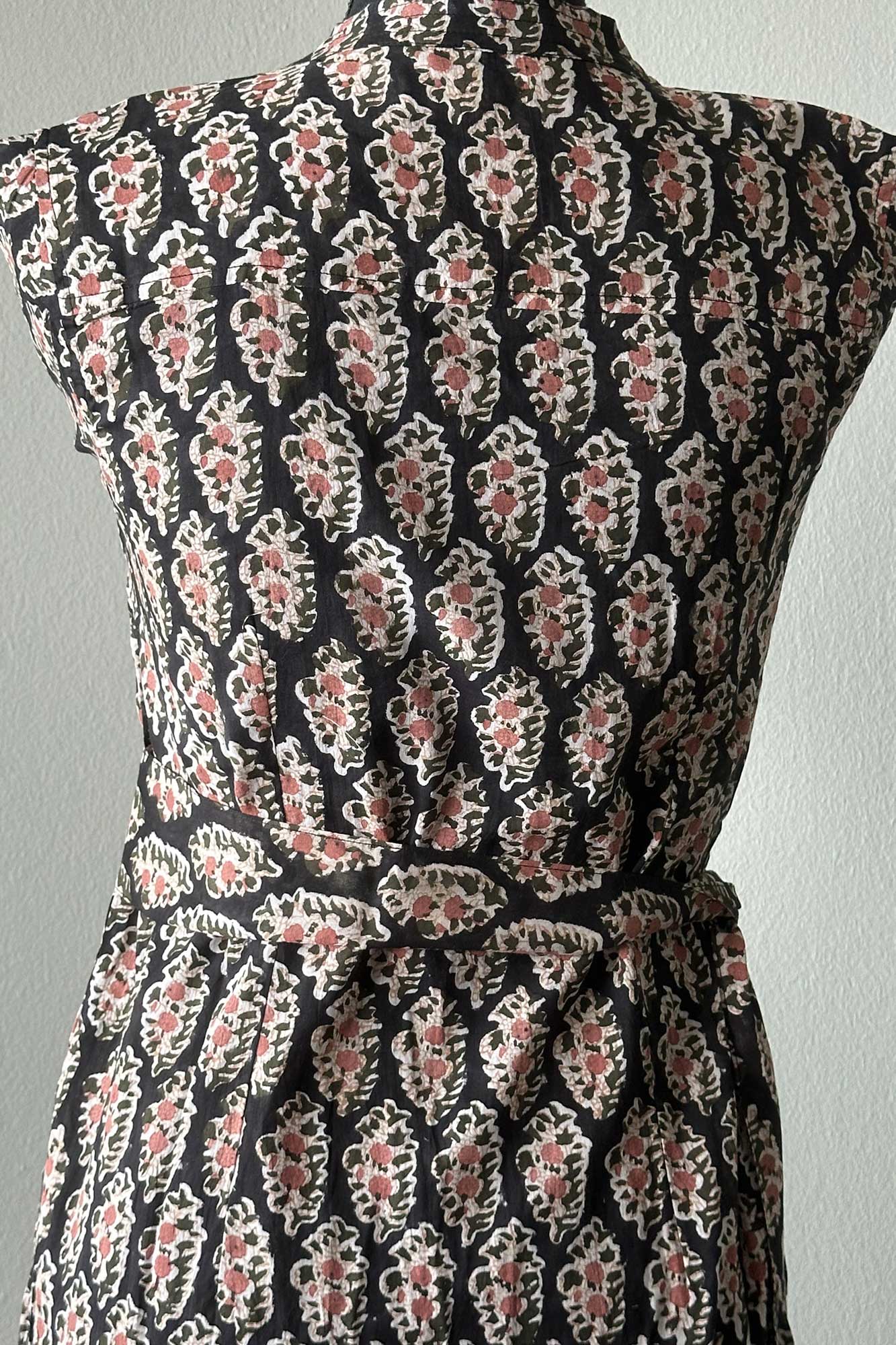 The Tulip midi is one of our favourite silhouettes. You can wear it with or without the sash belt that accompanies it. We like rolling up the sleeves and buttoning them. Block Printed on cotton with a black base patterned with delicate peach coloured flowers.