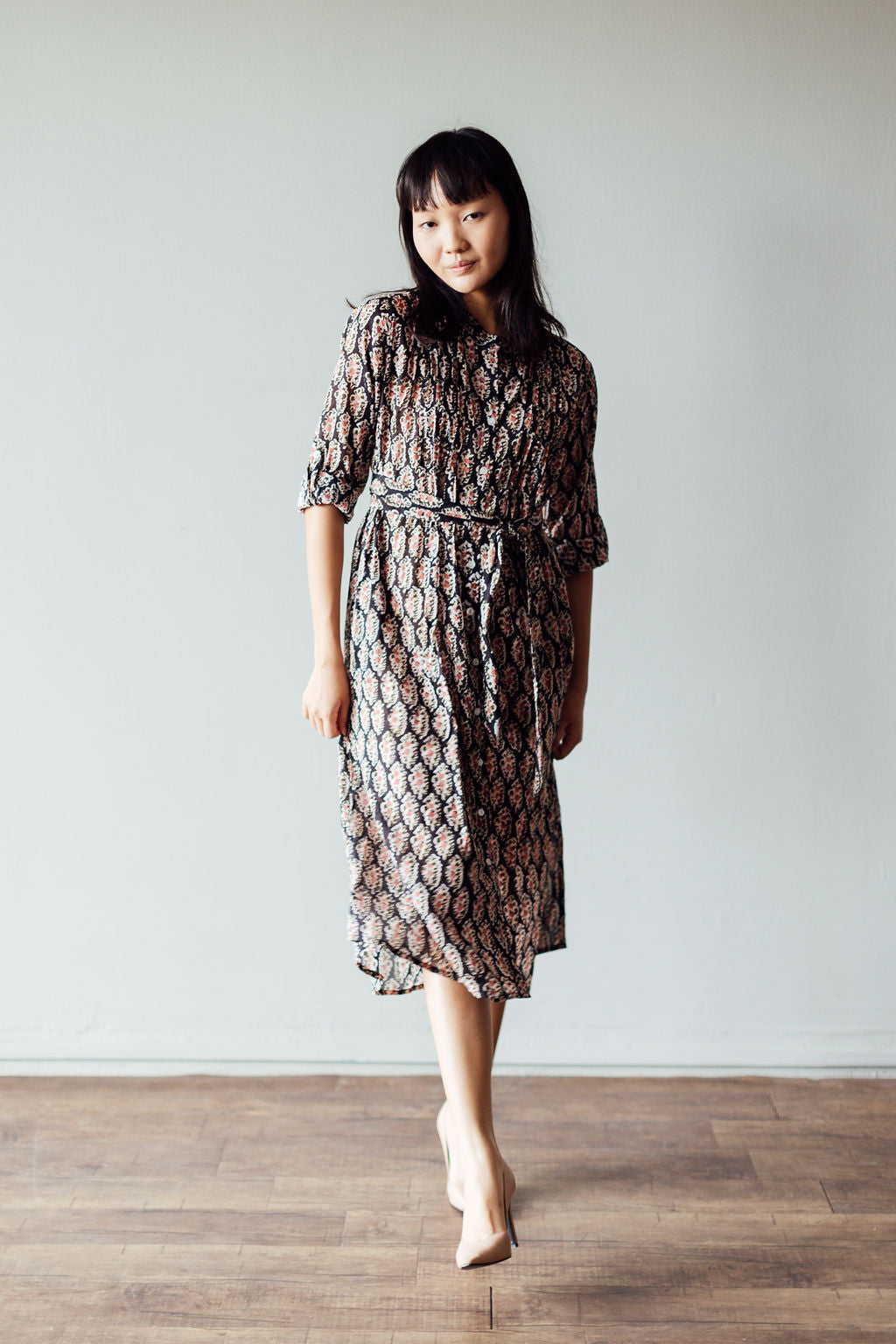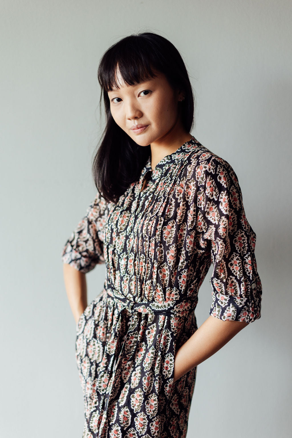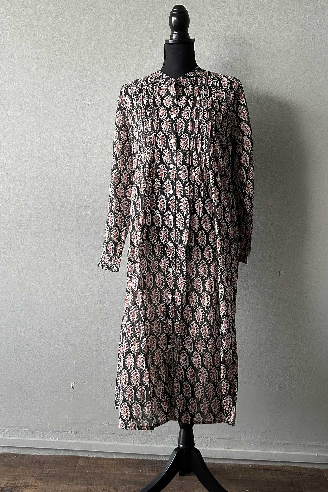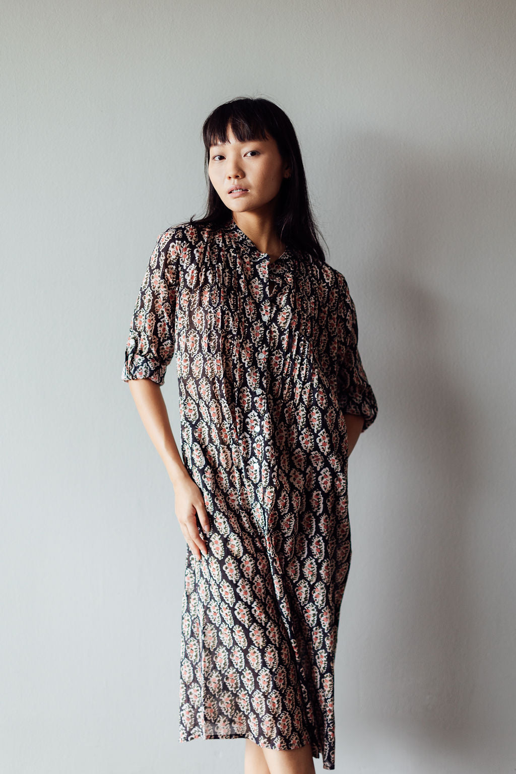The Tulip midi is one of our favourite silhouettes. You can wear it with or without the sash belt that accompanies it. We like rolling up the sleeves and buttoning them. Block Printed on cotton with a black base patterned with delicate peach coloured flowers.