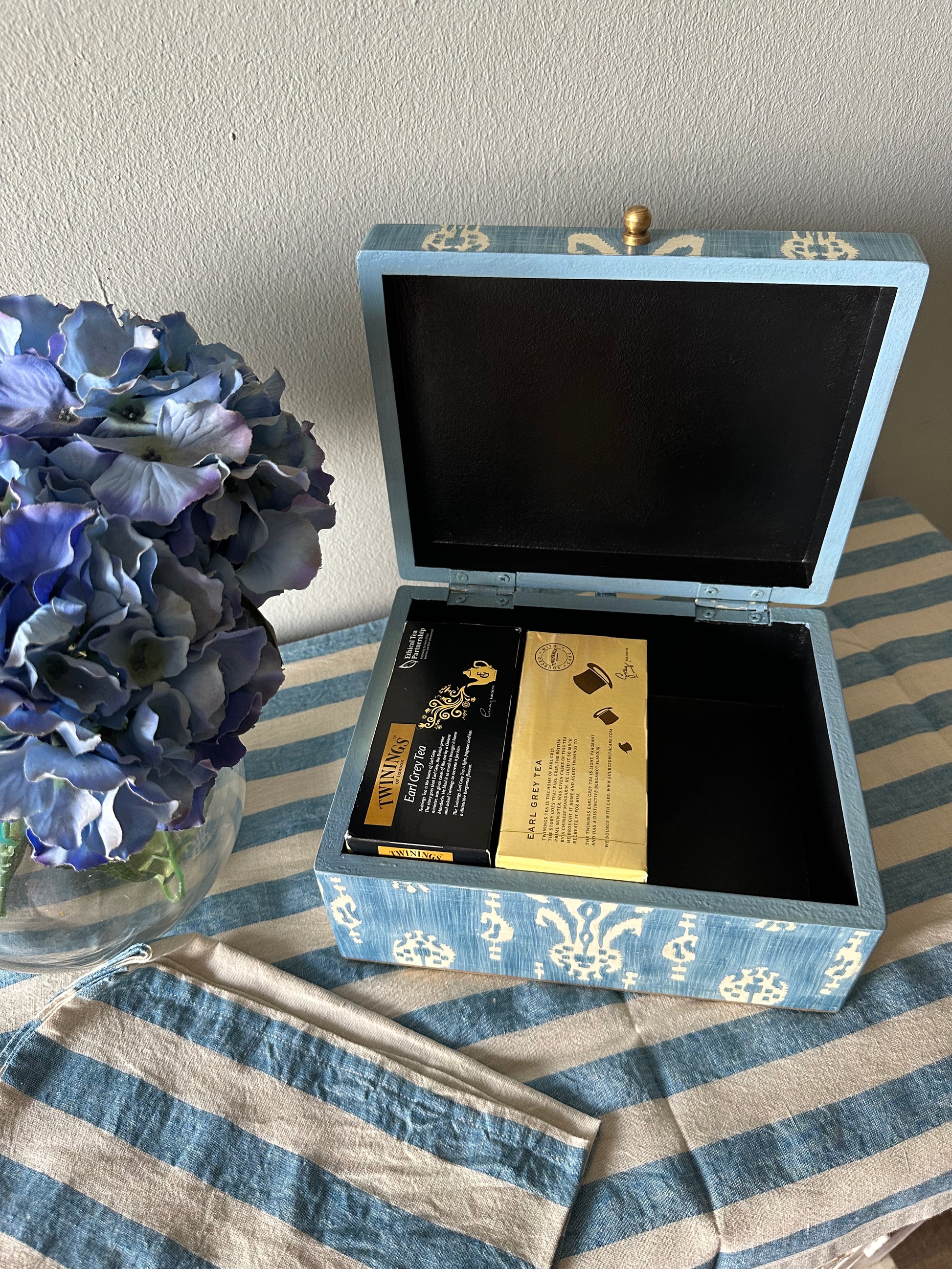 This beautiful hand painted box features a delightful blue and white Ikat pattern. It's perfect for storing jewellery, tea bags or even as a table top organizer A must have for fans of blue and white decor!