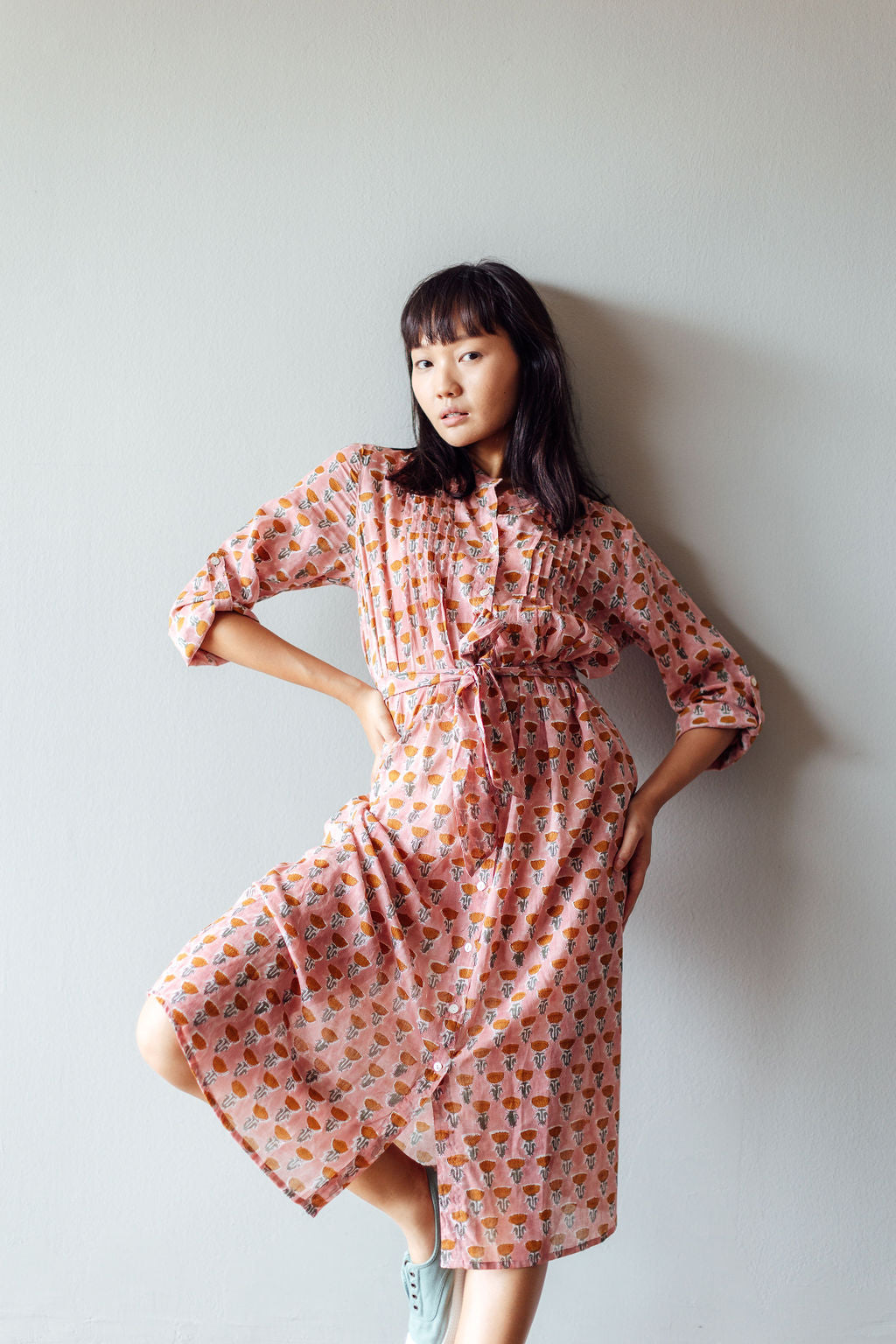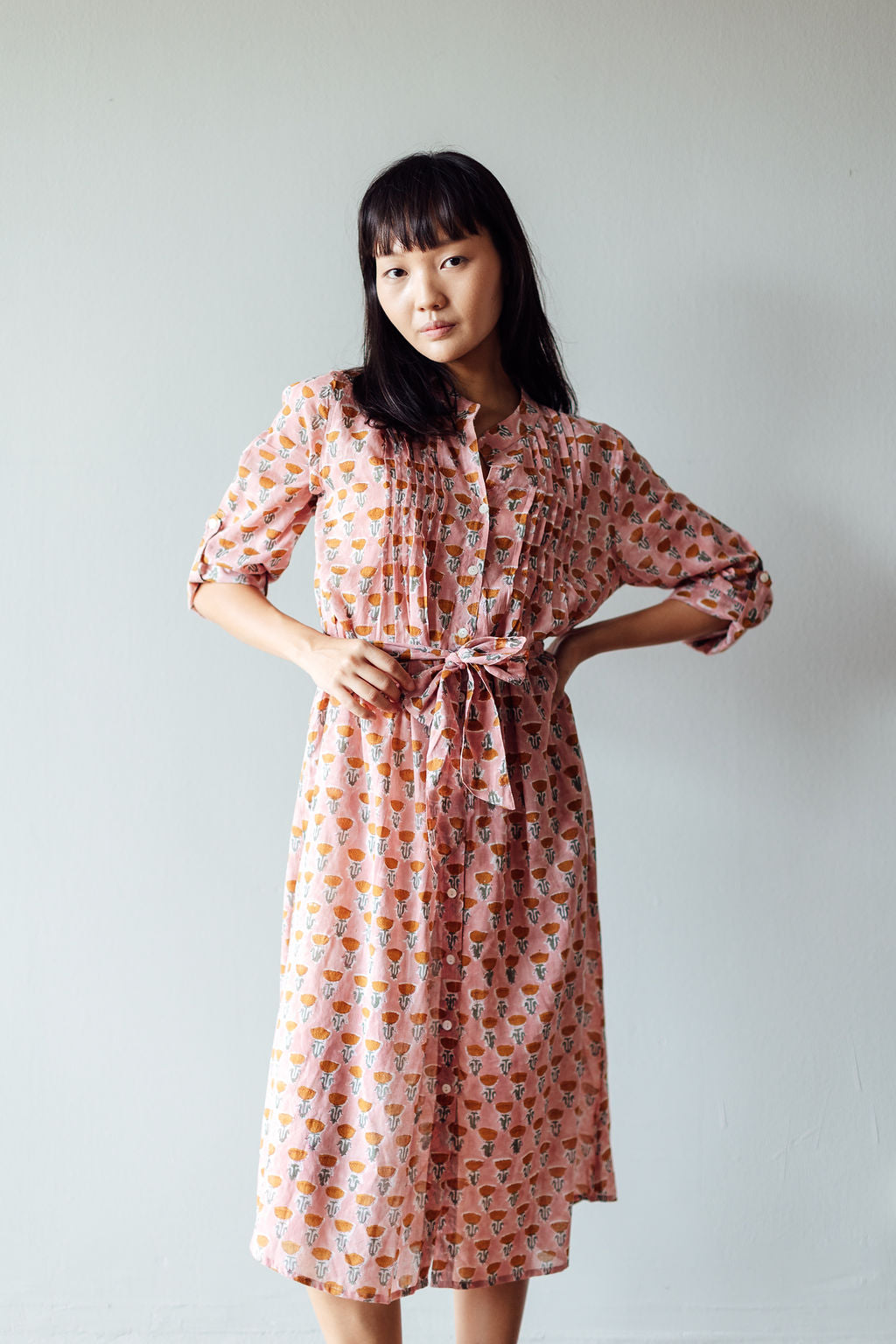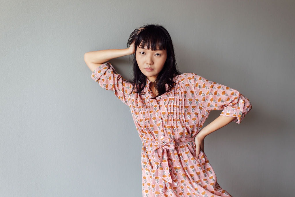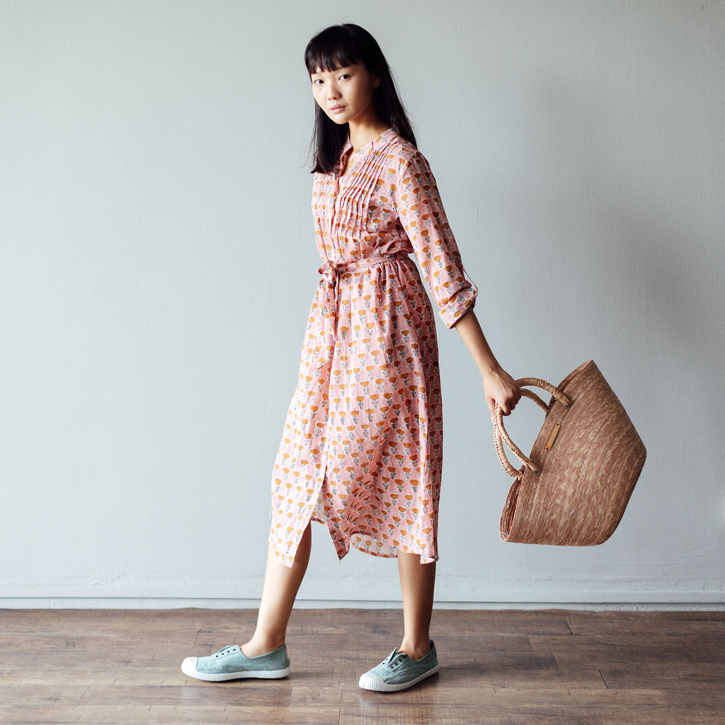 The Tulip midi is one of our favourite silhouettes. You can wear it with or without the sash belt that accompanies it. We like rolling up the sleeves and buttoning them. The dress is made from block printed cotton in a pleasing pink shade patterned with raw sienna flowers. We also love the fact that the dress has two pockets!