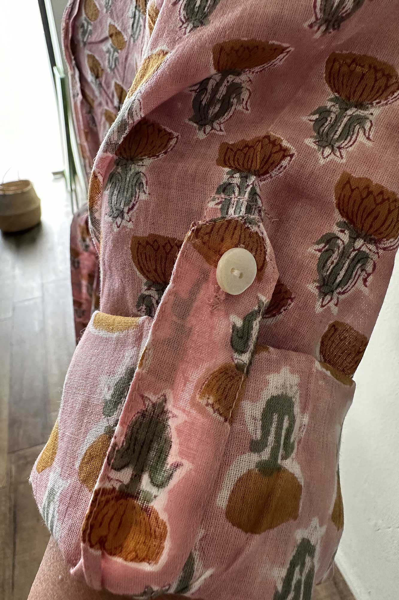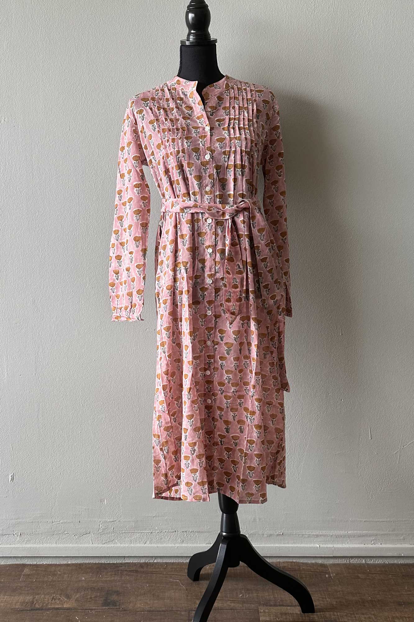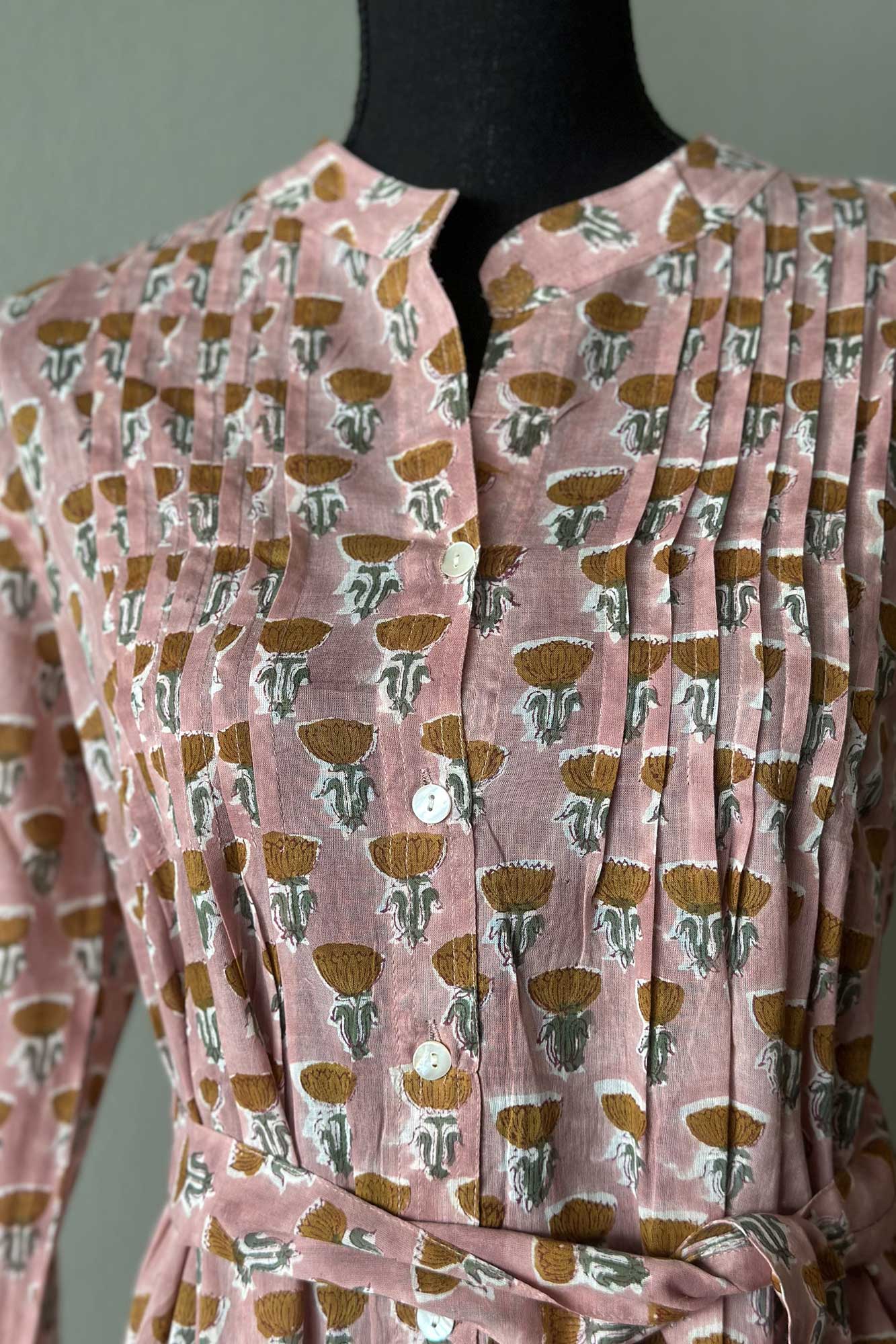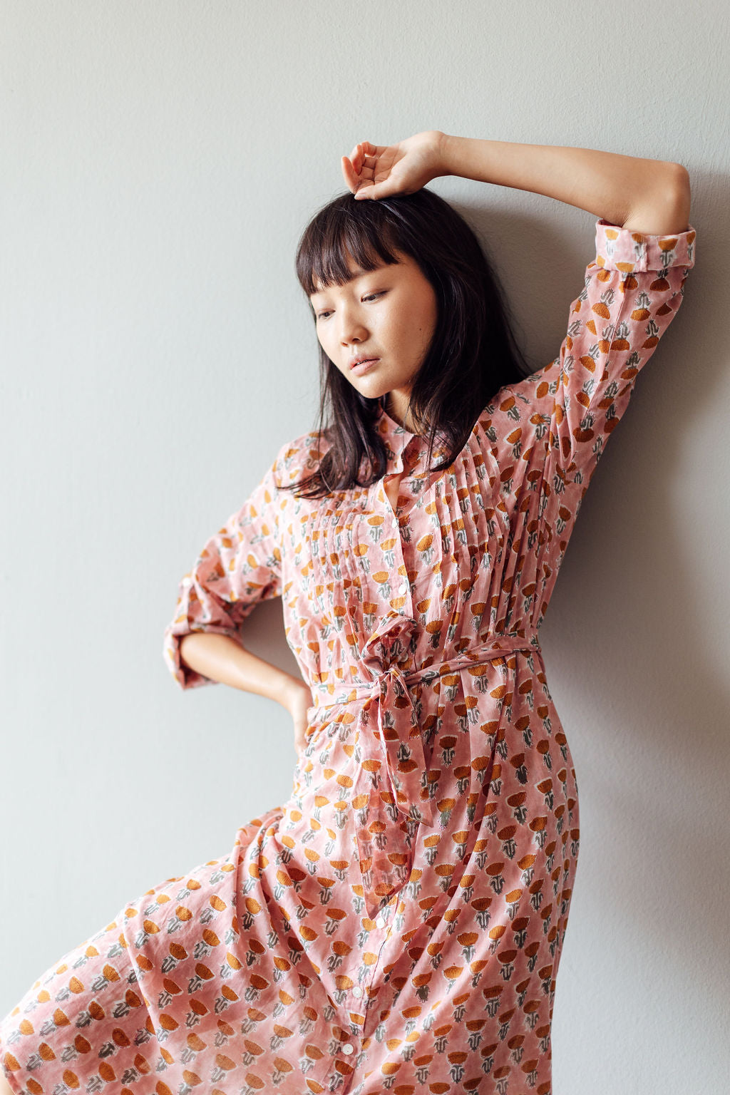 The Tulip midi is one of our favourite silhouettes. You can wear it with or without the sash belt that accompanies it. We like rolling up the sleeves and buttoning them. The dress is made from block printed cotton in a pleasing pink shade patterned with raw sienna flowers. We also love the fact that the dress has two pockets!
