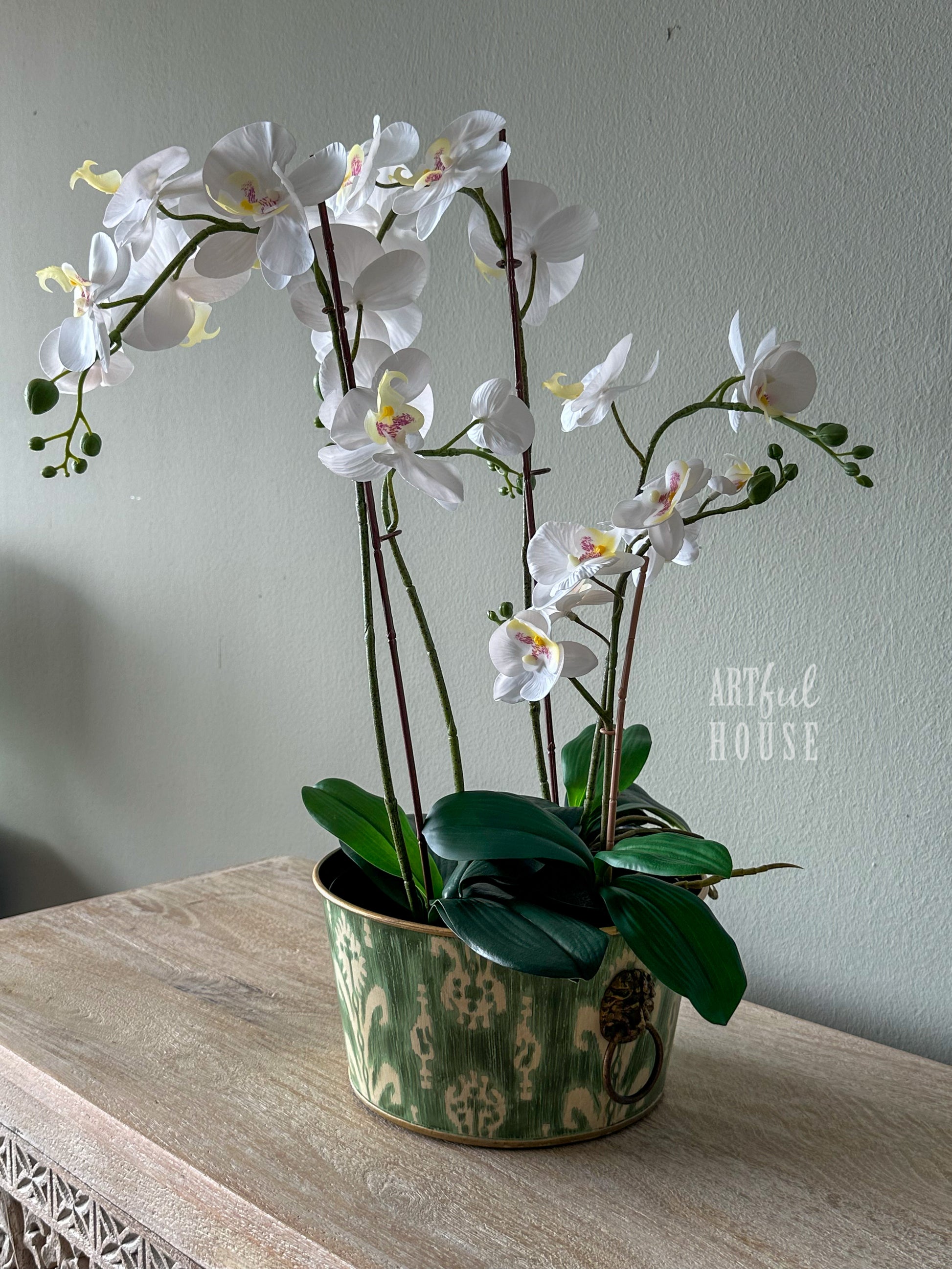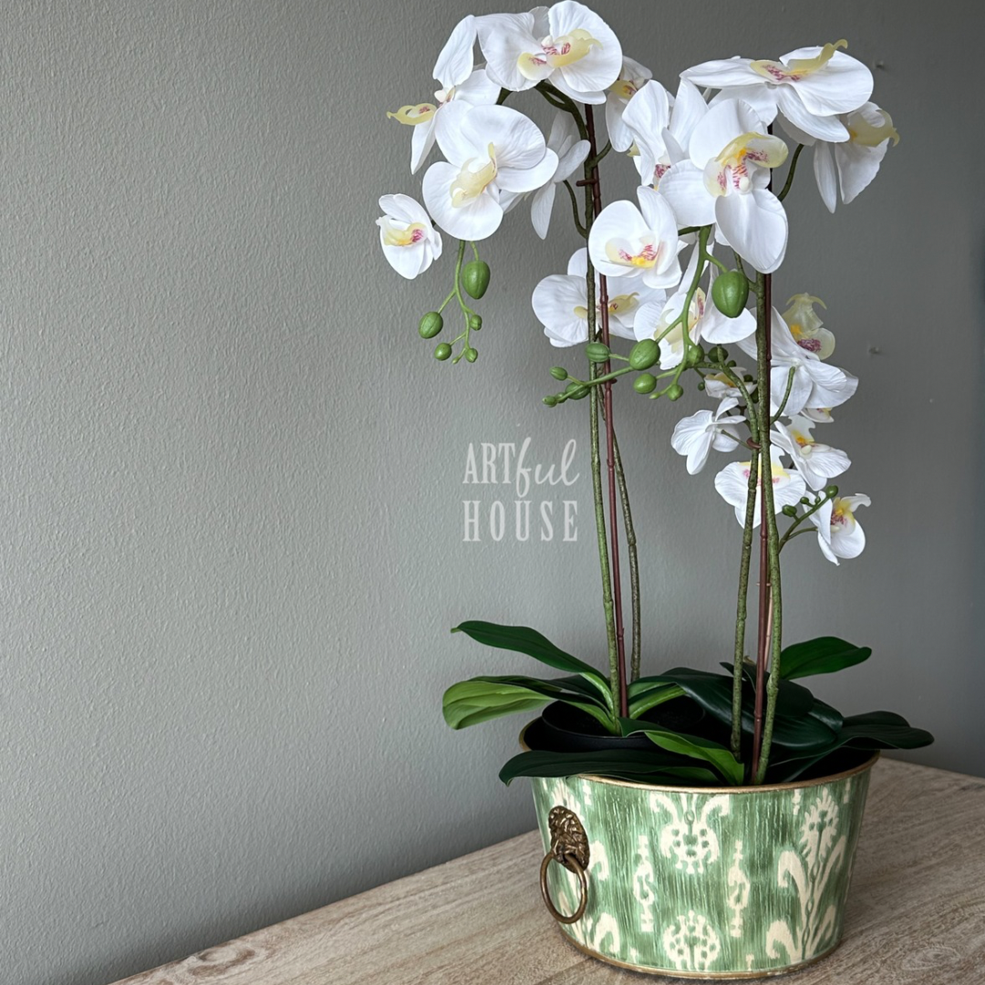Dress up your tables and cabinets with this stunning hand painted ikat planter. The planter comes with an inner liner for easy usage. Two lion's head brass coloured handles on either side add plenty of character to this piece. We recommend the inner liner with plants is taken out for watering the plants and excess water is then wiped off before placing the liner with plants is placed back. We've also used this planter to double up as a beer bucket and a drinks pail!