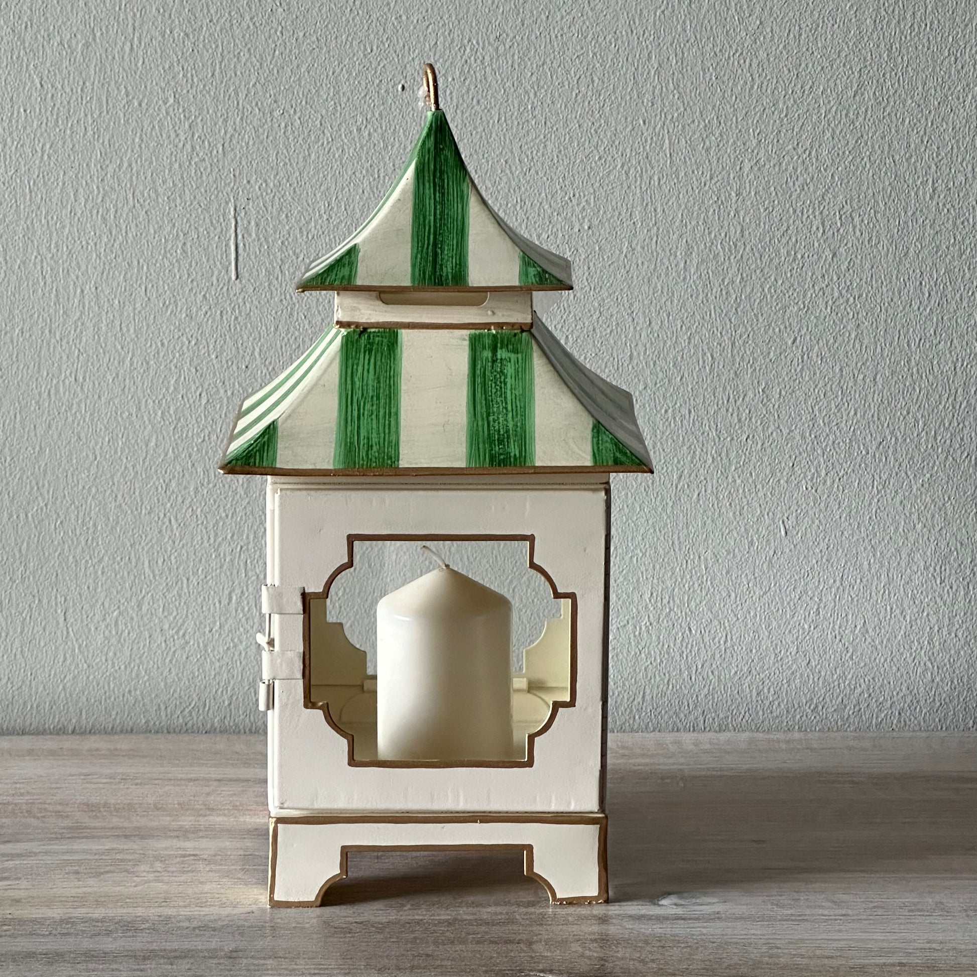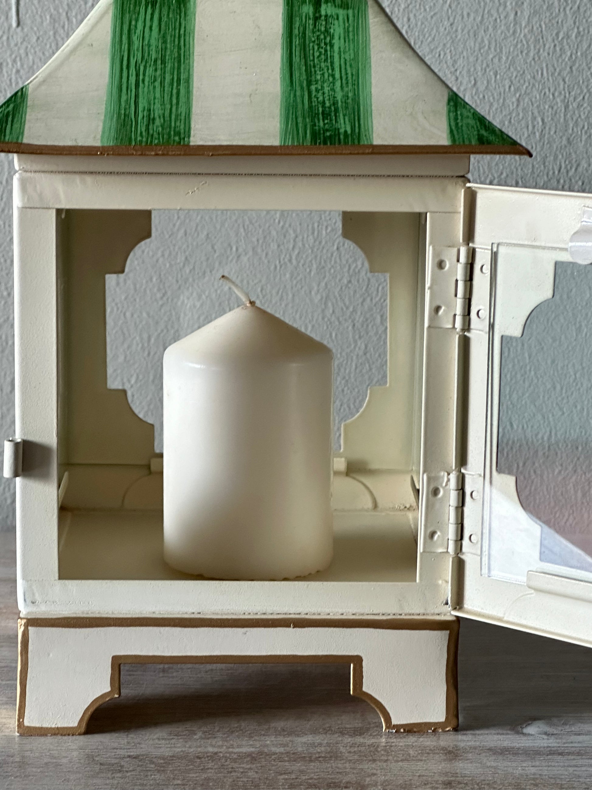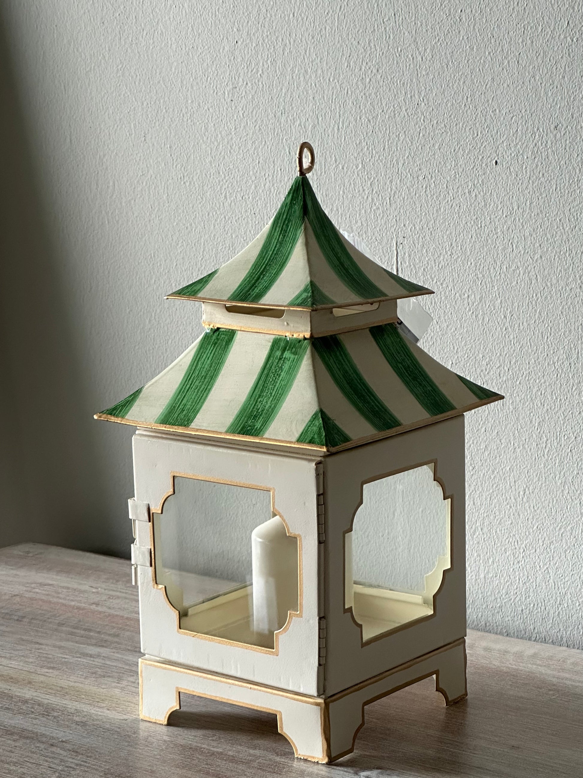 Our delightful pagoda shaped lantern is a perfect container for your candles. This artisanal product is hand painted in pleasing green and cream stripes and finished with gold on the edges. Place it on the ground or on a table and enjoy this welcome addition to your decor