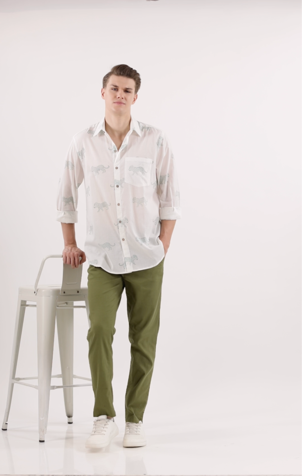 Unveiling our Men’s Green King Leopard shirt hand printed on the softest cotton with our green king leopard. Yes, our leopard decided to wear a royal Indian turban! This shirt is sure to add casual, sophisticated style to your wardrobe with a fun element thrown in. Like to pair with your other half get her to check out our Brompton Women’s Top and Ginza Women’s Trouser also printed in the green or blue King Leopard. Better still gift it to your other half!