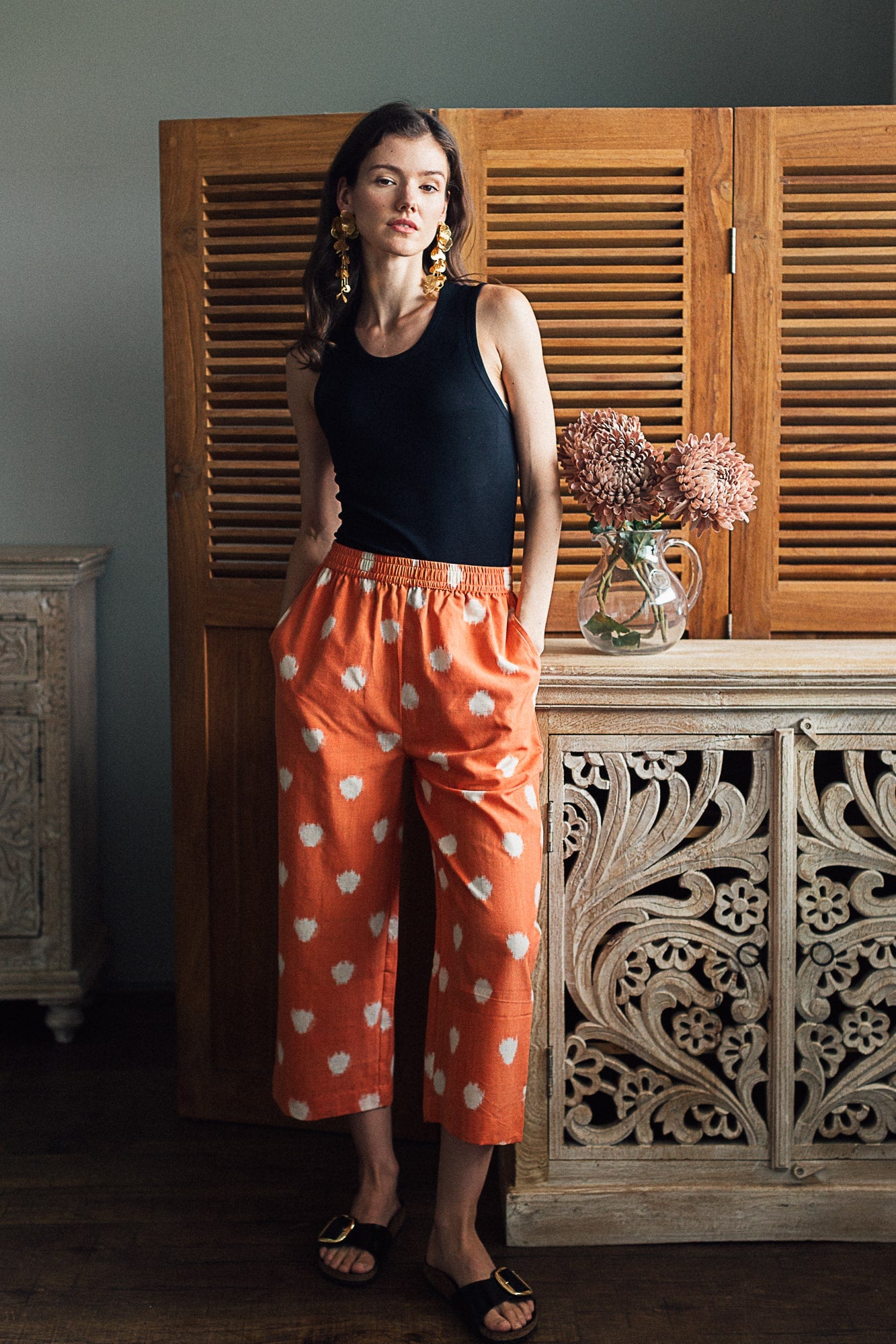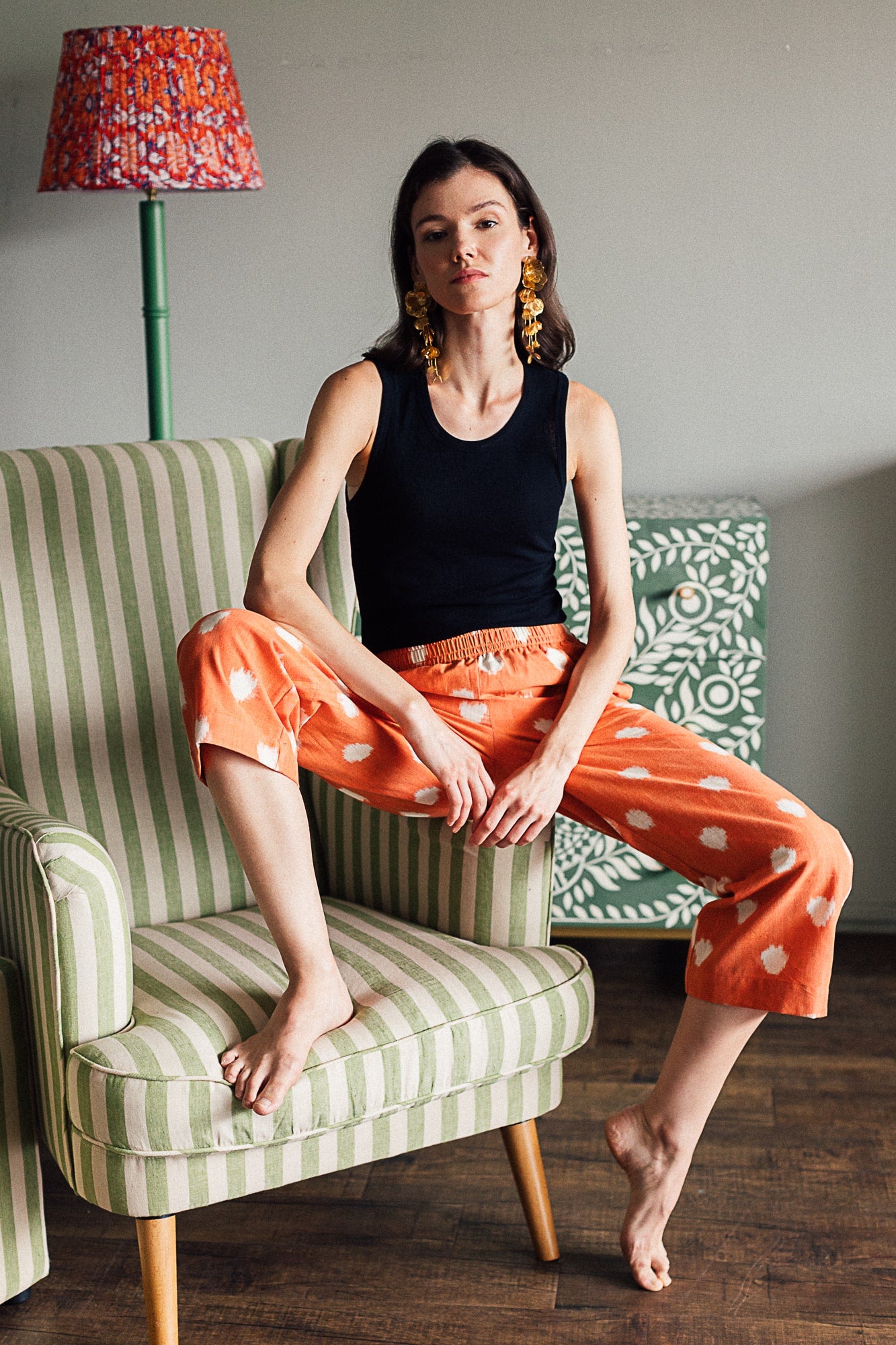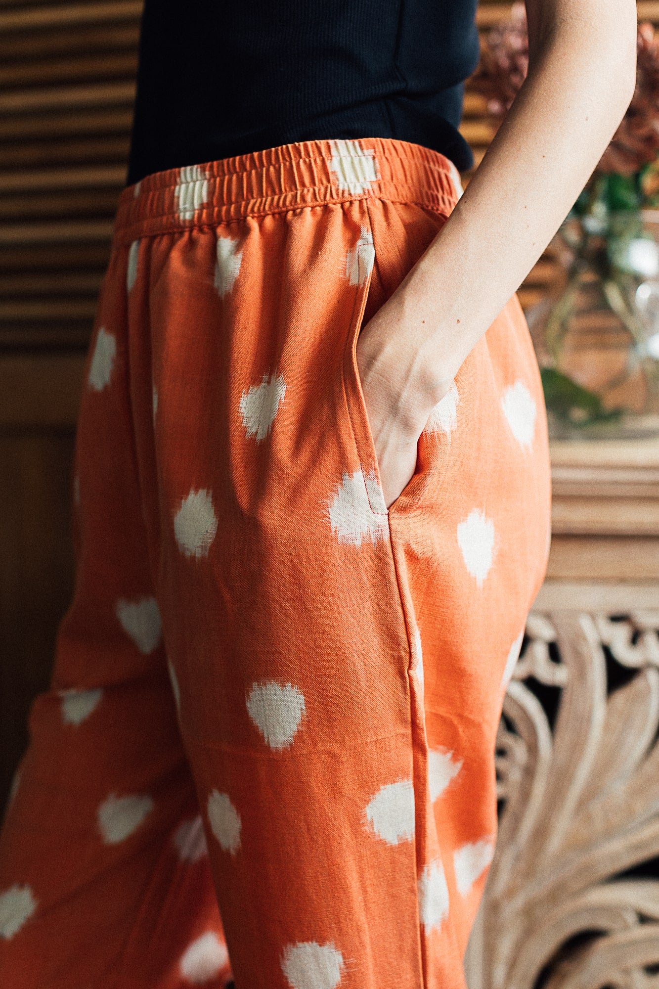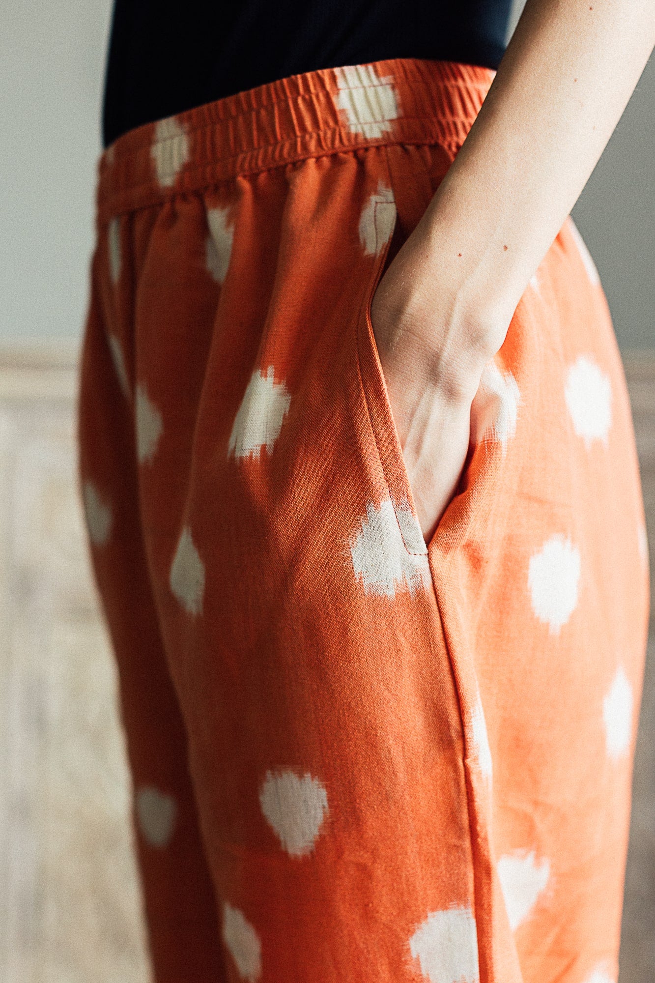 Our Peach Ikat Dot Trouser is made of artisanal cotton ikat patterned with white dots on a peachish coral base. Please see the closeup of the fabric to get a closer idea of this delightful shade. We experimented with both black and white accessories for this look and both look amazing with this shade.Our multi-colour Ikat trouser is made of artisanal cotton ikat in pleasing soft colours. We think it’s soft colour palette makes it an elegant day outfit. Dress it up as you like- we’ve paired it with a pink shirt here but you could really pick any shade from the trouser and change your look!