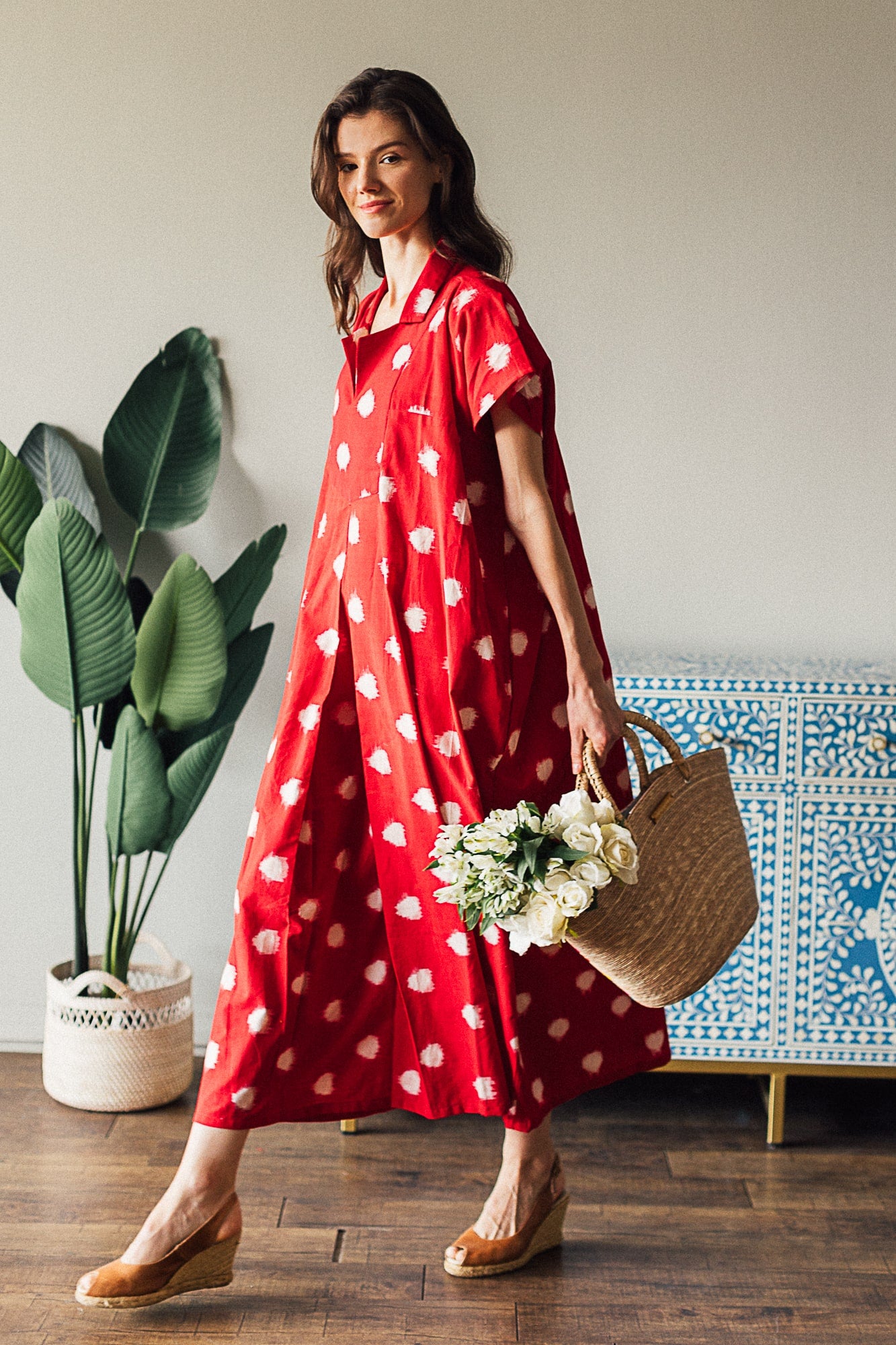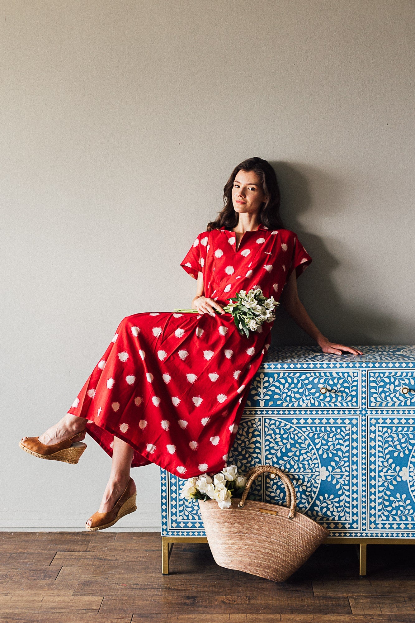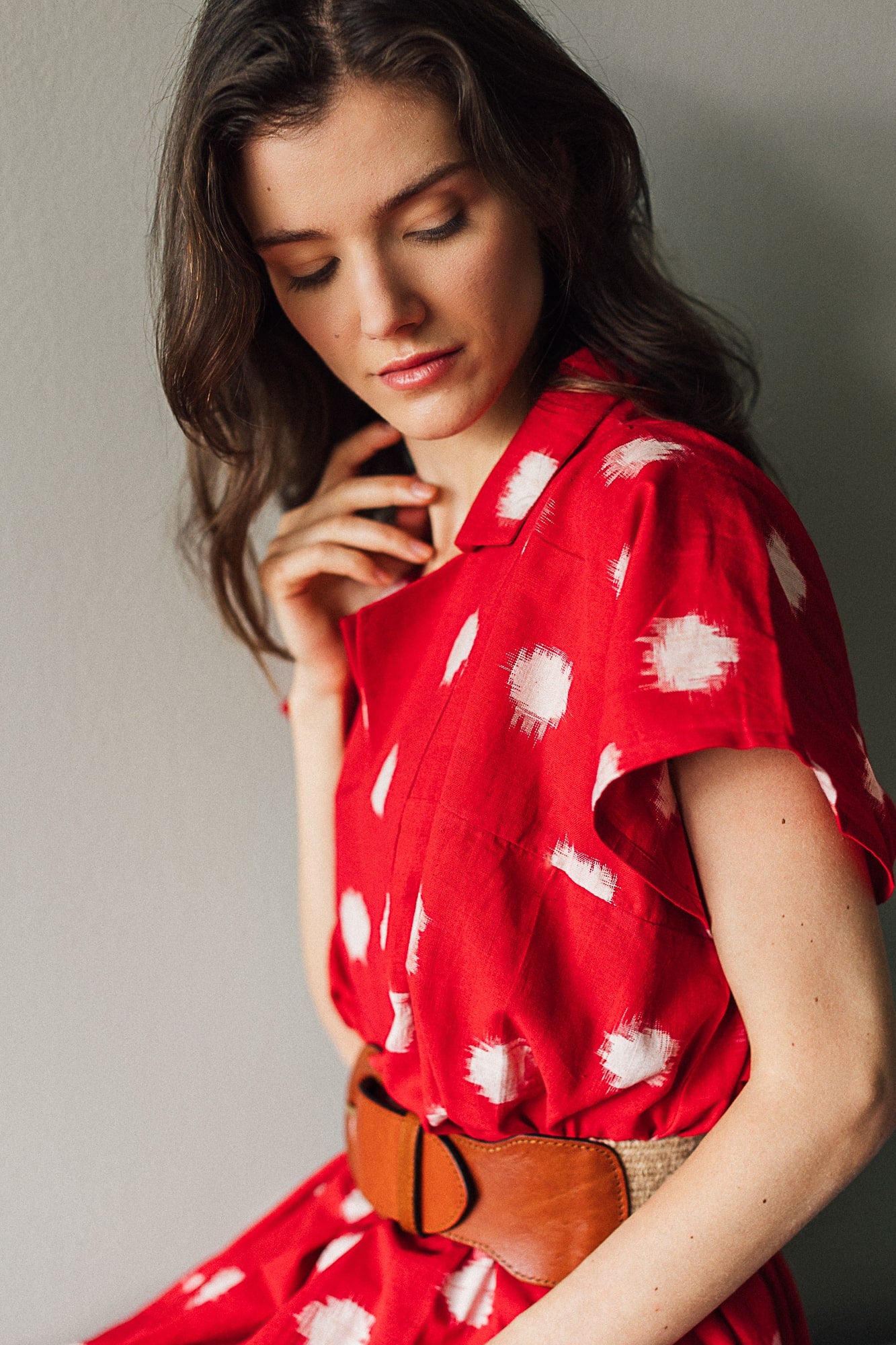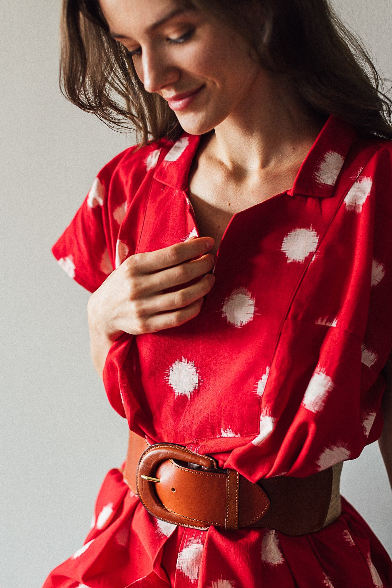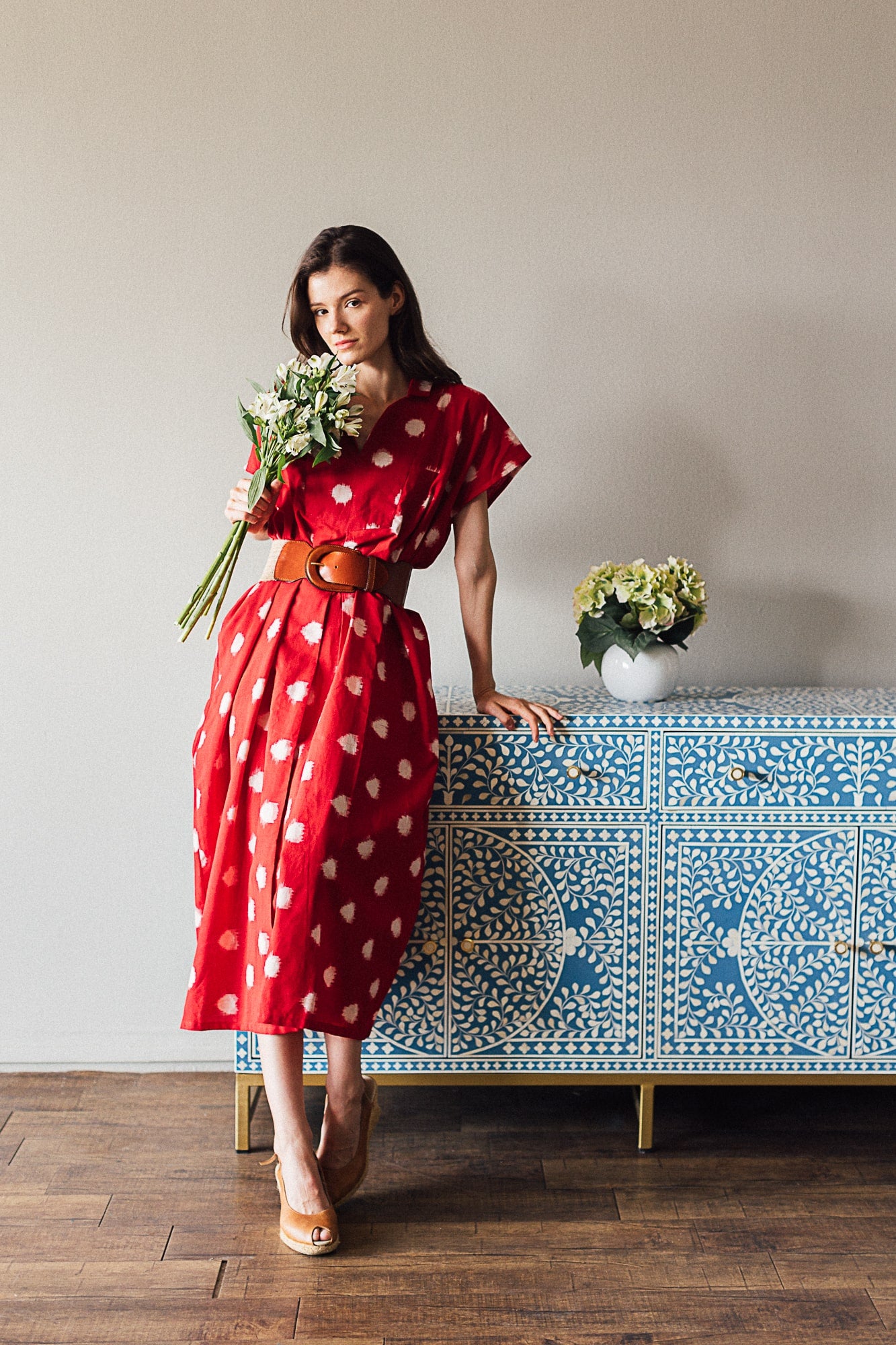 Our beautiful red dot dress is made of artisanal cotton ikat in a brilliant scarlet hue. This easy silhouette works for all sizes from S – L. Round Chest Measurement is approximately 50 Inches and the length is approximately 45 inches. This is a hand-crafted and hand dyed product which can result in slight non-uniformities which add to the beauty of the piece. Style it as a easy flowing dress or structure it with your own belt for a different silhouette. Please note the dress is sold with out a belt.