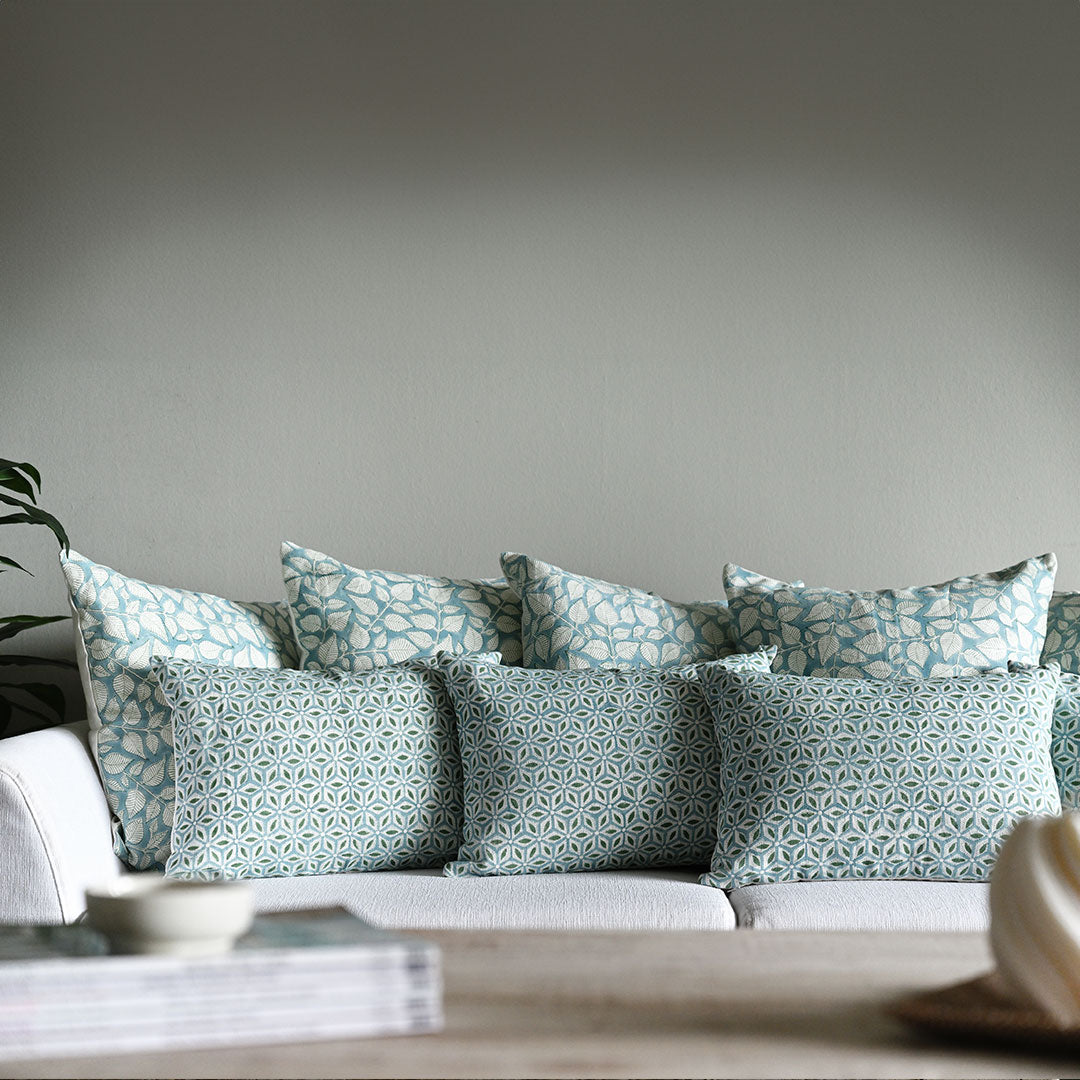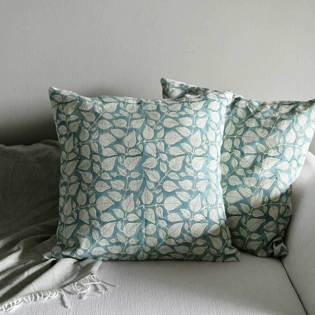 Sky Blue Leaf Pattern Hand Printed Linen Cushion